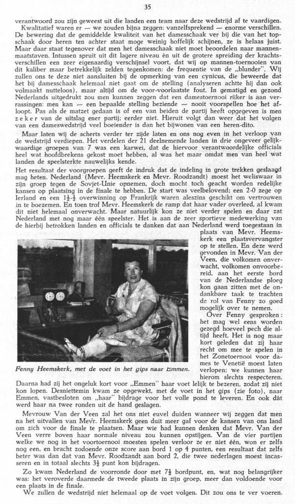 Quite the nicest part of any chess tournament is the memory of it. One month after the battle how differently everything looks! Gone are the frustrations, the nerves, and the sleepless nights. All we remember are the games we won brilliantly, of course, and the games we drew in won positions because we were tired. But the most enjoyable reminiscences, I think, are of those incidents, trifling mostly, which pass without comment at the time but which appear so delightful in retrospect. And the Women's World Team Championship at Emmen had its share.