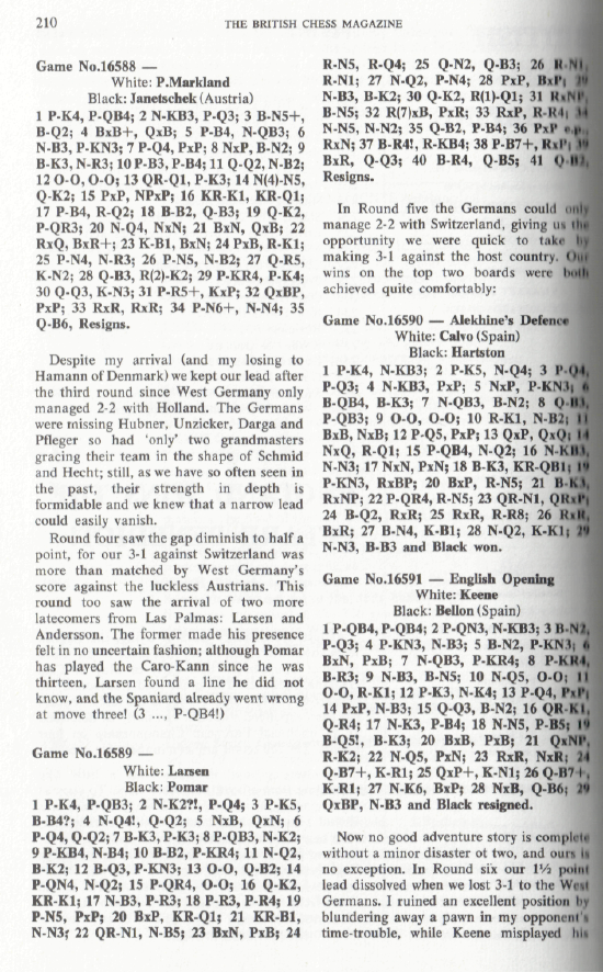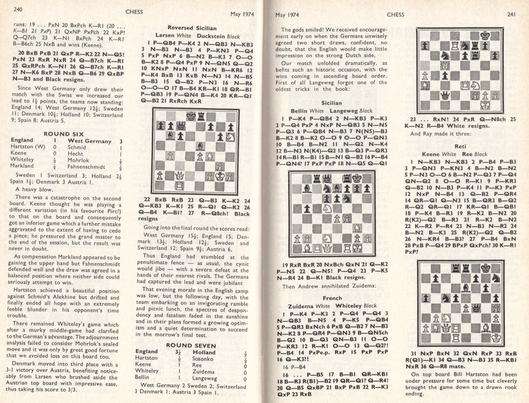 The Clare Benedict Tournament is an annual team event among eight Western European countries. It was organized and sponsored for a number of years by Miss Benedict, an American woman living in Switzerland. It was held this year in Minorca, Spain. The defending champions from West Germany were favored to repeat, with Holland and Denmark likely to furnish stiff competition. It was the English team which won, however, for the first time in the series. Though without a grandmaster, they had the youngest and most ambitious lineup. Of the seven matches, all with four men on a side, the English lost to West Germany by 3-1, tied with Denmark, and won the other five. Their point score was 18½ of a possible 28. The West Germans, who had been victors 12 times in the previous 20 tournaments, and had two grandmaster, Lothar Schmidt [that's how Kashdan spelled it - WJB] and Hans Hecht, on their side, were in second place with 17½ points. They did not lose any matches, but tied with Holland, Sweden and Switzerland. In third place was Switzerland, with 15 points. This was quite a success, as the team was rated much lower on an individual basis. The other final standings were: Denmark 14½, Sweden 14, Holland 13, Spain 10½ and Austria 9. Bent Larsen of Denmark and Ulf Andersson of Sweden, top players for their teams, missed several of the early matches because they were in a tournament in Las Palmas, Spain. / Written by Isaac Kashdan, Los Angeles Times, August 18, 1974 / * * * Tournament review by Robert Bellin ("Chess", May 1973): Tournament review by W. R. Hartston ("British Chess Magazine"): |