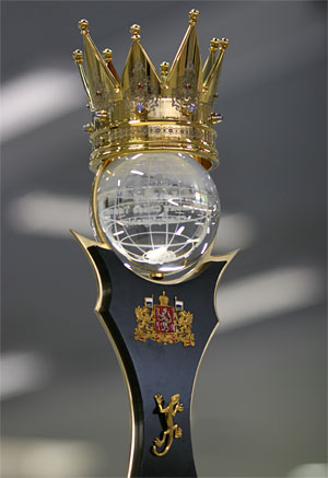 The golden trophy for the first place weighs for about 15 kg, its height is more than 70 cm. It is decorated with 16 precious Urals stones: garnet, corundum and lavender pheonite. The sphere is made of optical glass with a laser engraving inside. Ural specialists spent more than a month creating the golden Cup.