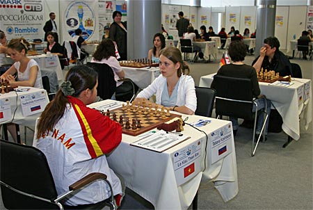 Round 1 – May 20th: In the first round of the championship China beat Vietnam resoundingly with 3½—½. The Russian team easily won against the Germans with a 3—1 score. Tatyana Kosintseva and Nadezhda Kosintseva drew against Elizabeth Pähtz and Ketino Kachiani-Gersinska; Ekaterina Korbut beat Jessika Nill and Ekaterina Kovalevskaya beat Maria Schöne.