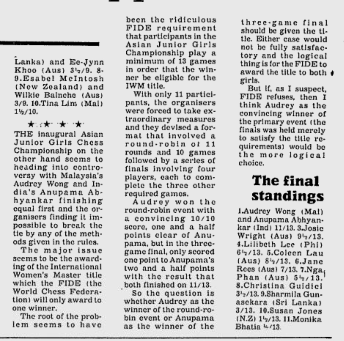 | 1. | Adelaide | 1985 | =Abhyankar, Anupama =Wong, Audrey |