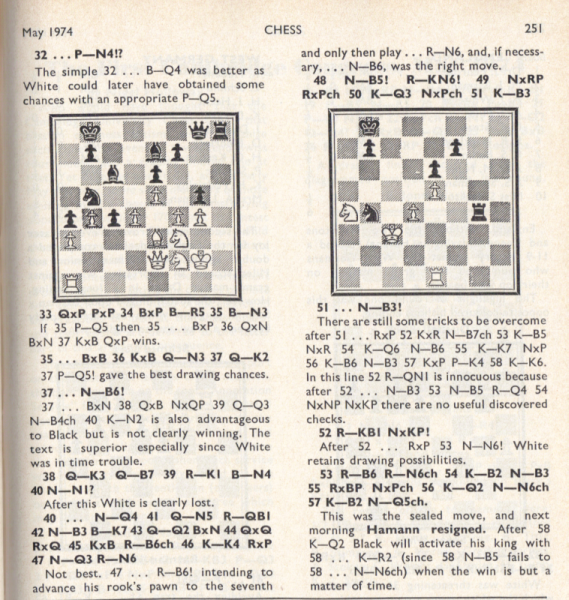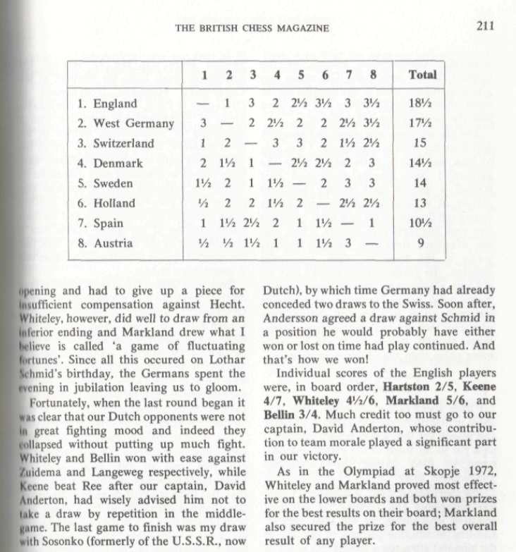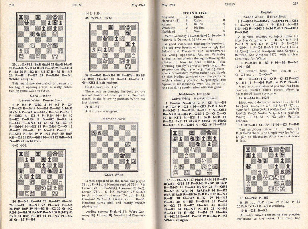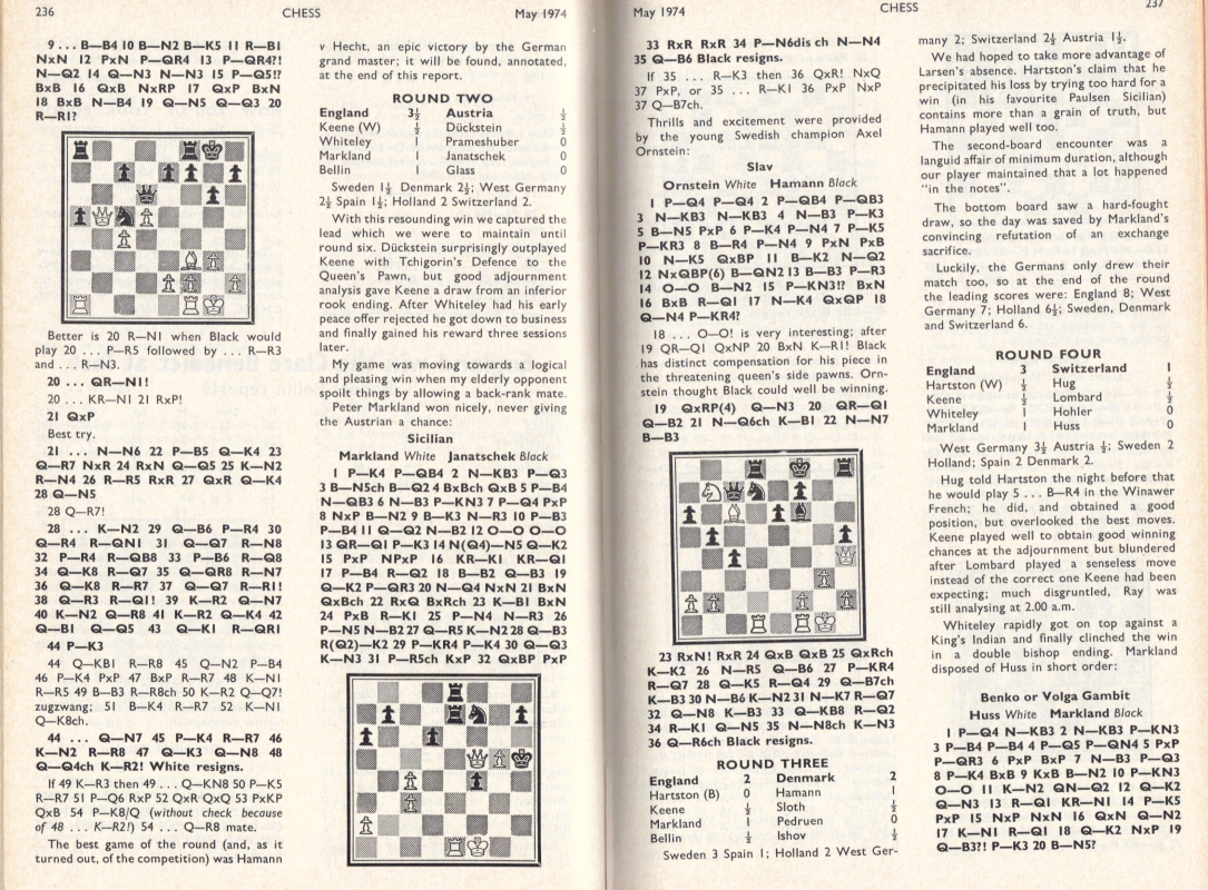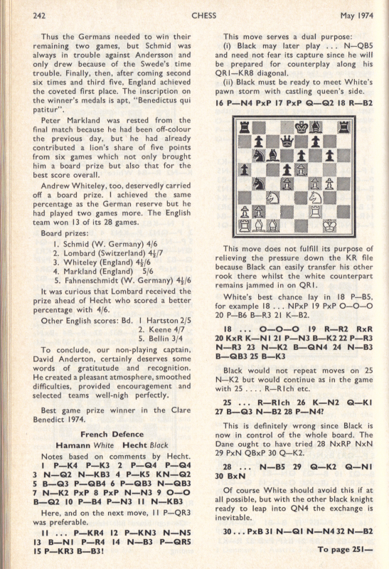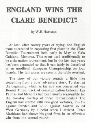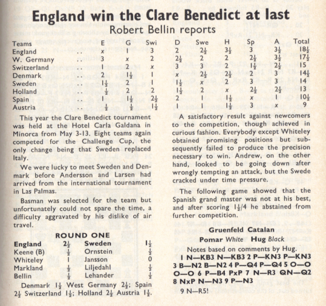 The Clare Benedict Tournament is an annual team event among eight Western European countries. It was organized and sponsored for a number of years by Miss Benedict, an American woman living in Switzerland. It was held this year in Minorca, Spain. The defending champions from West Germany were favored to repeat, with Holland and Denmark likely to furnish stiff competition. It was the English team which won, however, for the first time in the series. Though without a grandmaster, they had the youngest and most ambitious lineup. Of the seven matches, all with four men on a side, the English lost to West Germany by 3-1, tied with Denmark, and won the other five. Their point score was 18½ of a possible 28. The West Germans, who had been victors 12 times in the previous 20 tournaments, and had two grandmaster, Lothar Schmidt [that's how Kashdan spelled it - WJB] and Hans Hecht, on their side, were in second place with 17½ points. They did not lose any matches, but tied with Holland, Sweden and Switzerland. In third place was Switzerland, with 15 points. This was quite a success, as the team was rated much lower on an individual basis. The other final standings were: Denmark 14½, Sweden 14, Holland 13, Spain 10½ and Austria 9. Bent Larsen of Denmark and Ulf Andersson of Sweden, top players for their teams, missed several of the early matches because they were in a tournament in Las Palmas, Spain. / Written by Isaac Kashdan, Los Angeles Times, August 18, 1974 / * * * Tournament review by Robert Bellin ("Chess", May 1973): Tournament review by W. R. Hartston ("British Chess Magazine"): |