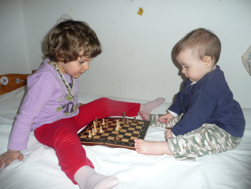 The website regulars must know these two charming young ladies. Teresa has just turned three and attends kindergarten already while Klara will be one year old on February 26th. These two little humans are responsible for the website growing not as fast as it could! Despite of their junior age both girls are avid chess players. On the New Year Day evening they asked me to play a game of chess. I agreed gladly although I was a bit afraid as a few days ago Klara started to crumple the white King curiously and almost choked on it as she took it straight into her tiny mouth. More than expected, the game went on to interesting finish...